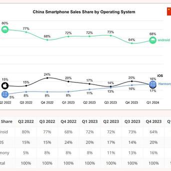 过去,iOS系统在中国市场的份额曾高达24%,但随着华为在技术创新上的持续投入,鸿蒙系统的市场份额稳步上升。到了2024年,鸿蒙OS以17%的市场份额成功超越了iOS的16%,实现了中国在智能手机操作系统领域的首次领先。